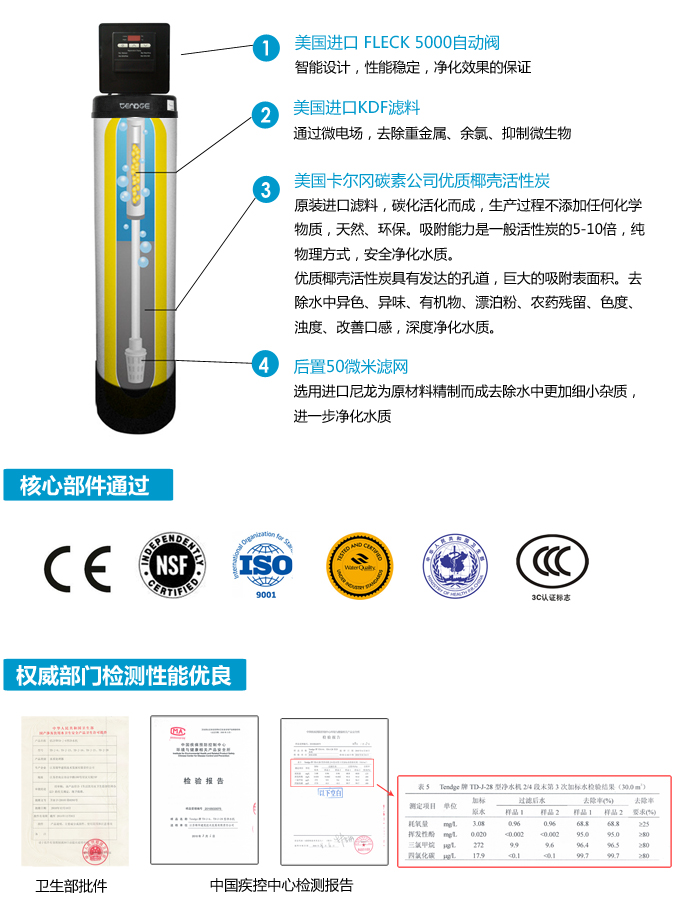 全屋凈水中央凈水機有效去除水中的異色、異味;進一步濾除水中微小雜質(zhì)、膠狀體;去除水中的漂白粉余氯、農(nóng)藥、重金屬;保留對人體有益的礦物質(zhì)。使水變得碧清、碧藍,去除對人體有害的物質(zhì)。